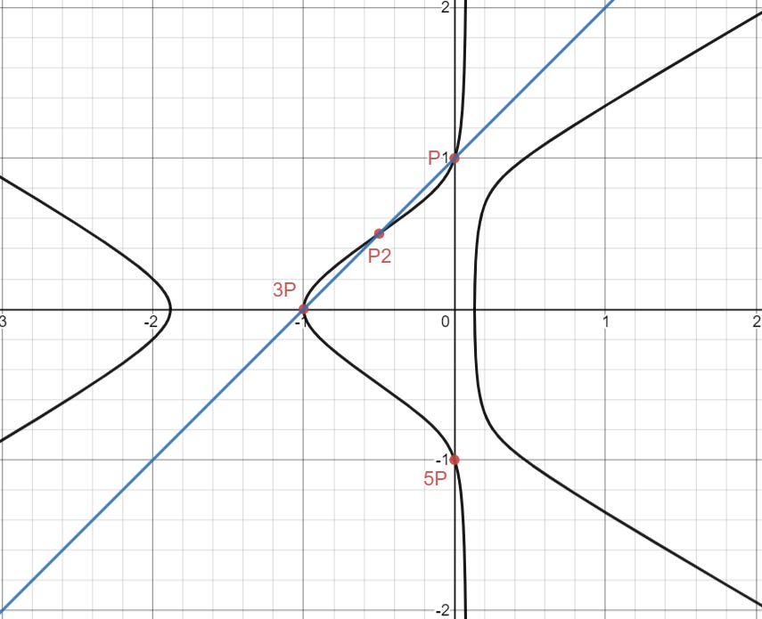 Anyways, we now know that if we connect two rational points on the elliptic curve, then we can get another rational point on the curve. Let’s try it out.
