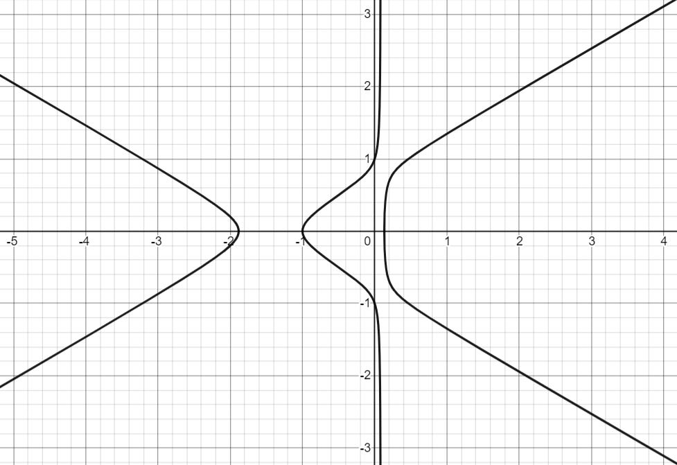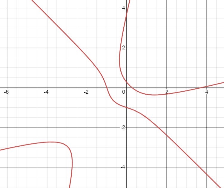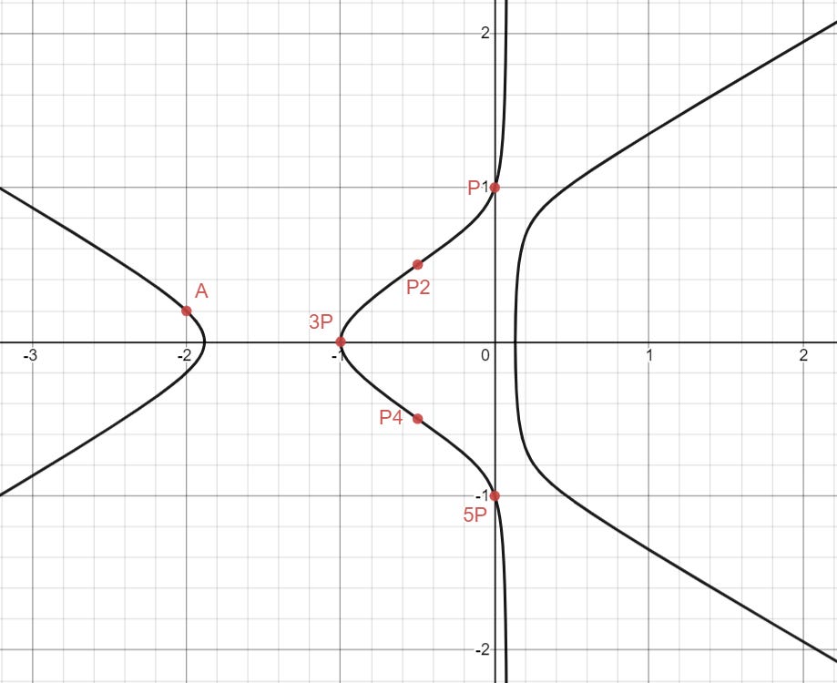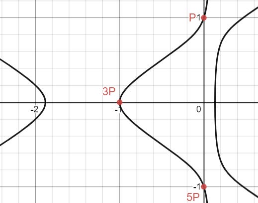 Just by looking at the graph, there are some pretty easy rational points that we can spot: (0, 1), (-1, 0), and (0, -1), which I will call P, 3P, and 5P. (There is a reason for the weird labels, we will see why later).