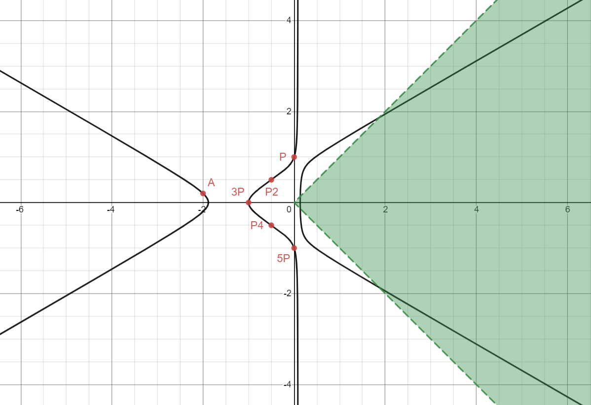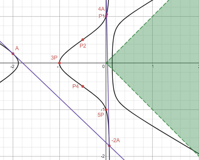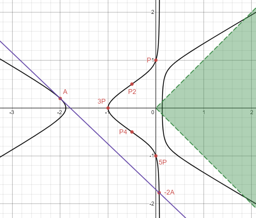To reiterate, our goal is to find a rational point on the curve that lies in this region. Hence, this turns into a fun little game of “math football”: We need to use the line trick to generate more and more points until we reach the “goal” that is the green region.