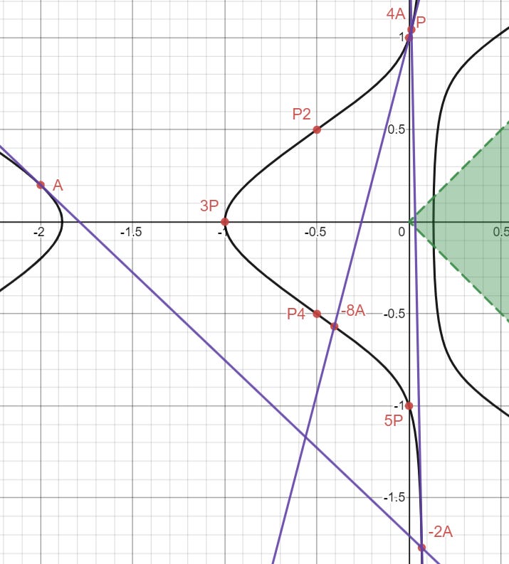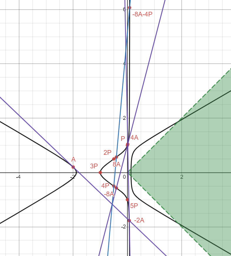 We’re done with tangents now! For convenience’s sake, I also plotted down the point 8A, which is just -8A with negated y2-coordinate, and I connected 4P and 8A with a line to get the point -8A - 4P: