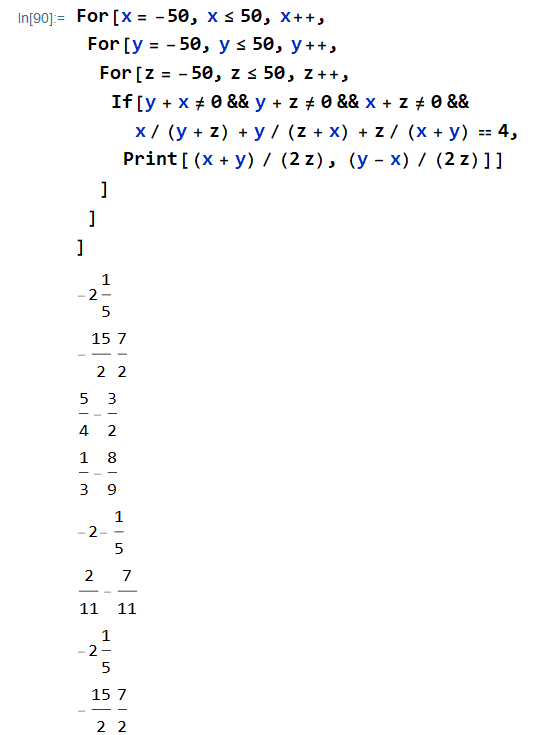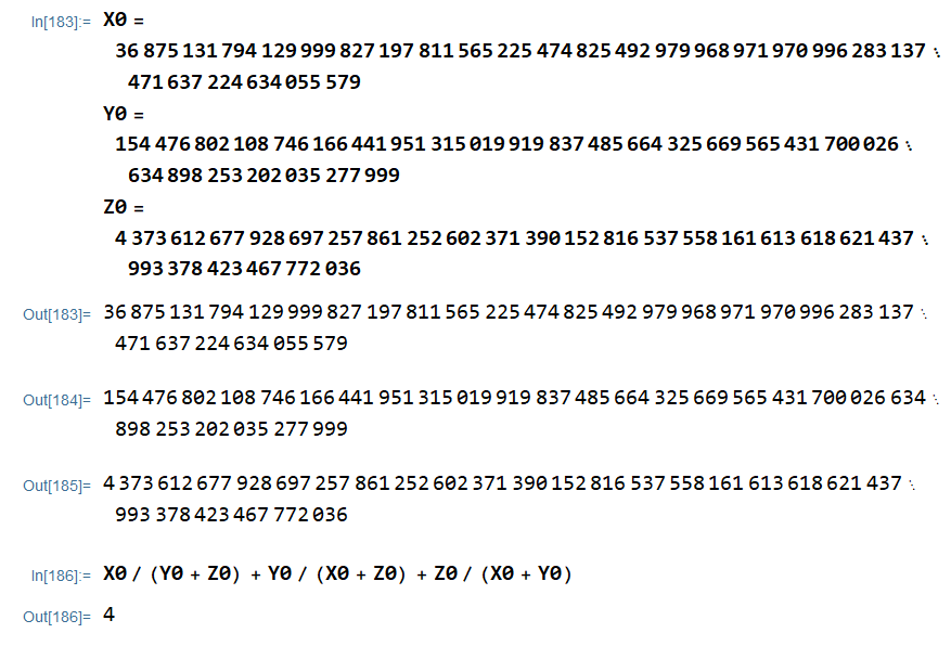 Recalling that these are equal to x/z and x/z respectively, we let z be the LCM of the denominators and x, y be the resulting numerators when we find a common denominator. This gives us the following humungous solution... in positive integers!