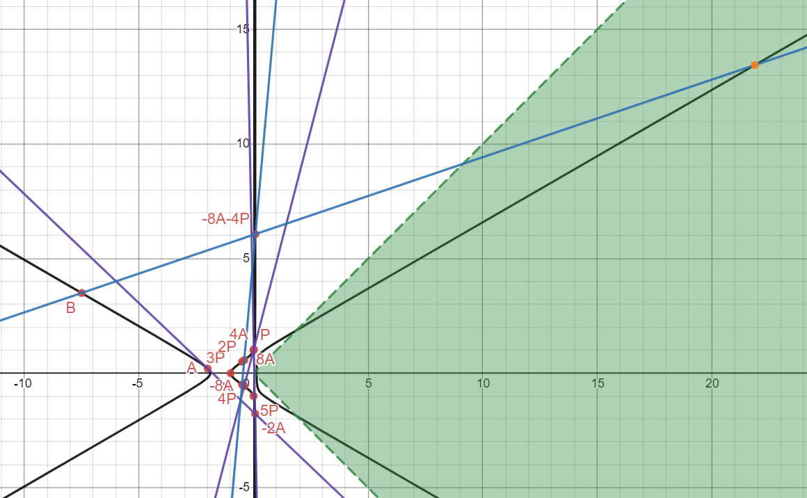 This was my plan! You might be confused as to why I am so happy about getting this point. The idea is that I needed a point quite high up there somehow in order to finally get into the green region with one more line. What is that line you ask? I’m glad you asked! All this time, I had been saving this one last “nice” rational point I was saving until the very end: B = (-15/2, 7/2) which you might remember was the second less trivial rational point that we obtained from Mathematica. By drawing the line between B and -8A - 4P, we finally end up with a point in the green region: